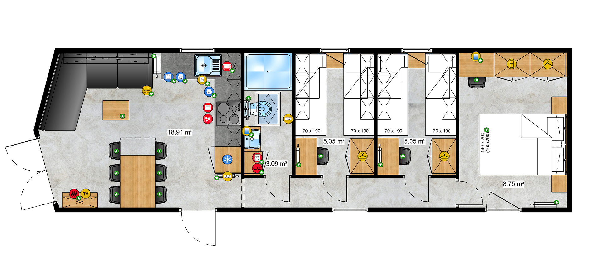 Die charakteristische Giebelwand des Modells Ibiza hat auch eine wichtige Funktion. Sie vergrößert das Raumgefühl des Wohnzimmers erheblich und verleiht ihm zudem eine originelle Form und einen originellen Stil. Ibiza macht seinem Namen alle Ehre, denn Ibiza steht für lichtdurchflutete Räume und Entspannung.